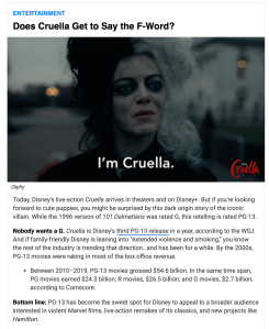 Nobody wants a G. Cruella is Disney’s third PG-13 release in a year, according to the WSJ. And if family-friendly Disney is leaning into “extended violence and smoking,” you know the rest of the industry is trending that direction…and has been for a while. By the 2000s, PG-13 movies were raking in most of the box office revenue.